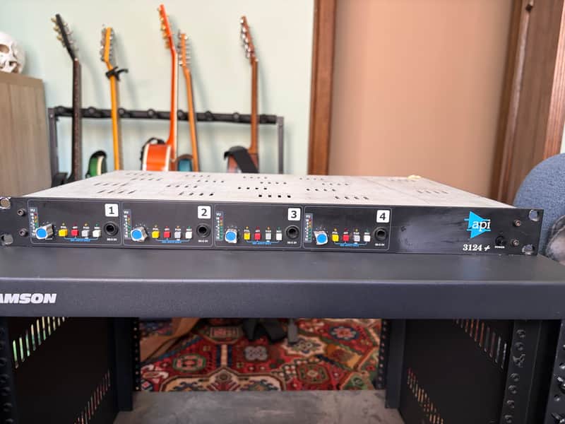 Purchased in 2015 and used in a studio environment. All four channels operate correctly, unit powers on as expected, and all pots/switches are working cleanly with no known mechanical or operational issues.Cosmetically, the unit shows normal signs of use for its age. There are some scratches and marks from being moved around in studio racks over the years, including wear around the top rack-mount holes, light scratches on the top panel, and a small mark on the front panel where tape residue was previously removed. Purely cosmetic and does not affect performance.This is a classic API preamp known for its punch, clarity, depth and unmistakable analogue character. The 3124+ has been a staple in professional studios for decades and is ideal for drums, vocals, guitars, bass, overheads and anything needing forward, musical tone with excellent transient response.Includes standard IEC power cable (AU plug). No original box.A proven professional studio unit with the famous API sound.