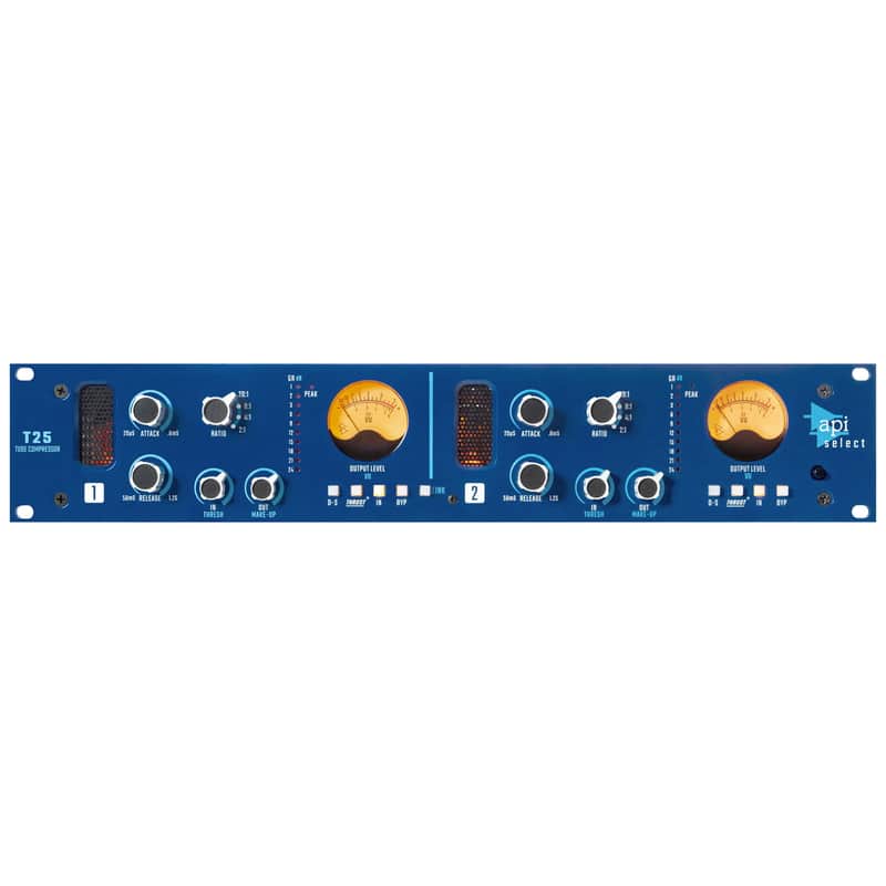 Tube meets FET meets API Select range, ready to rock your studio's rack! The API Select T25 is a classic 2-channel, FET feedback-style compressor/limiter with a Class-A tube output stage that utilizes a custom API transformer. Built with 12AT7WC and 12BH7 dual-triode vacuum tube, the T25 represents a new direction in API's line of compressors. It offers the user a powerful and flexible feature set, including the ability for use in either dual mono or stereo mode, and is carefully engineered to deliver classic tube performance. The T25 excels at delivering the unmistakable sound of API and features our industry-exclusive Five Year Warranty. Features Field Effect Transistor (FET) based gain reduction circuit Audio circuit uses 12AT7WC and 12BH7, dual-triode vacuum tubes Custom proprietary API output transformer 11-step attack time switch 11-step release time switch 4 fixed ratios 31-step input/threshold control 31-step output/make-up gain control Detented controls for accurate recall Patented THRUST® switch for frequency-dependent side chain control D-S feature provides high-frequency dependent side-chain control for de-essing Link Switch for stereo operation 10-segment LED gain reduction meter LED peak indicator Classic analog VU meters for output IN/OUT switch Full hard-wired relay bypass XLR and 1/4" TRS input and output connections Specifications Input Impedance: 20kΩ Output Impedance: 75 ohms, can drive 600 ohm loads Maximum Output Level: +24dBu Frequency Response: 20Hz – 40kHz (+0dB / -1dB) Ratios: 2:1, 4:1, 8:1, 20:1 (switchable) Attack Times: 20μs – 0.8ms Release Times: 50ms to 1.2s Total Gain: +40dB, IN/OUT both fully CW SNR: 90dB Power Consumption: 45W Size: 19" x 3.5" x 12" Deep Size (Boxed for Shipping): 21" x 9" x 15" Actual Weight: 14 lbs. Shipping Weight: 17 lbs.