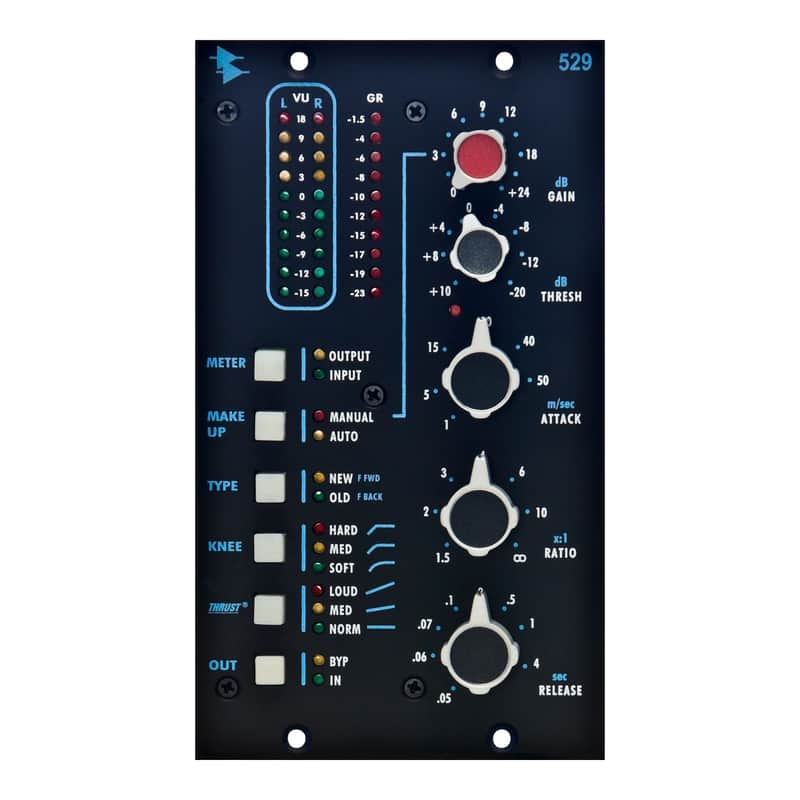 Based on the unprecedented success of the 2500, the 529 takes many of the features and controls from API's famous stereo compressor and puts them into the first dual slot 500 series module from API. This stereo compressor features API's patented THRUST® circuitry for a punchy low end, along with an Old/New switch that lets you choose between classic and modern compression characteristics: Old for vintage-style feedback compression and New for today's more common feed-forward compression. The Auto-makeup Gain button lets you adjust ratio and threshold controls without affecting the output level. Using API's discrete op-amps and transformer technology, the 529 delivers the legendary analog sound of API. The 529 is backed by API's unique 5 year warranty.