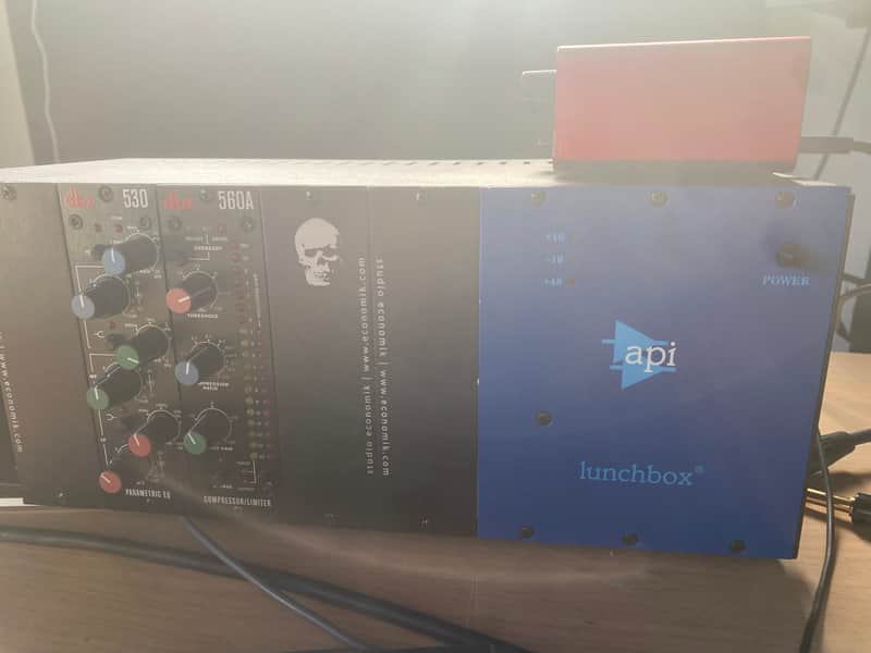 The API 500-6B lunchbox is a 6-slot rack designed to accept all API standard 5.25" X 1.5" modules. This quality allows an engineer the flexibility to bring along specialized EQ effects to any situation: 550A, 550b or 560. The lunchbox has an internal power supply with a rear panel selected AC voltage switch and a removable power cord. The input/output jacks are XLR. The lunchbox comes standard with a +48 volt internal phantom power supply, bussed to pin 15 for interface with the API 512c Mic Preamplifier.API makes several modules for the 500-6B, including the 512c Mic Preamplifier, the 525 Compressor, the 527 Compressor, the 550A 3-band EQ, the 550b 4-band EQ and the 560 Graphic EQ. Combinations of these modules make perfect stereo recording packages (two 512cs and two 550bs) or vocalist's box (one 512c, two EQs and one 527).Other uses for the versatile lunchbox include:Multi-track recording of acoustic and electronic audio sourcesSound reinforcement systems and recording to multi-track formatsMultiple facility projects where portability is a plusBroadcast and audio for video productionCustom channel input stripsNOTE: The older 560A equalizer may use pin 15 for a "direct output" and must be disabled on the