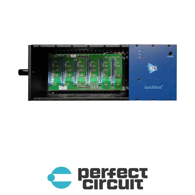 The API 500-6B lunchbox is a 6-slot rack designed to accept all API standard 5.25" X 1.5" modules. This quality allows an engineer the flexibility to bring along specialized EQ effects to any situation: 550A, 550b or 560. The lunchbox has an internal power supply with a rear panel selected AC voltage switch and a removable power cord. The input/output jacks are XLR. The lunchbox comes standard with a +48 volt internal phantom power supply, bussed to pin 15 for interface with the API 512c Mic Preamplifier.API makes several modules for the 500-6B, including the 512c Mic Preamplifier, the 525 Compressor, the 527 Compressor, the 550A 3-band EQ, the 550b 4-band EQ and the 560 Graphic EQ. Combinations of these modules make perfect stereo recording packages (two 512cs and two 550bs) or vocalist's box (one 512c, two EQs and one 527).
