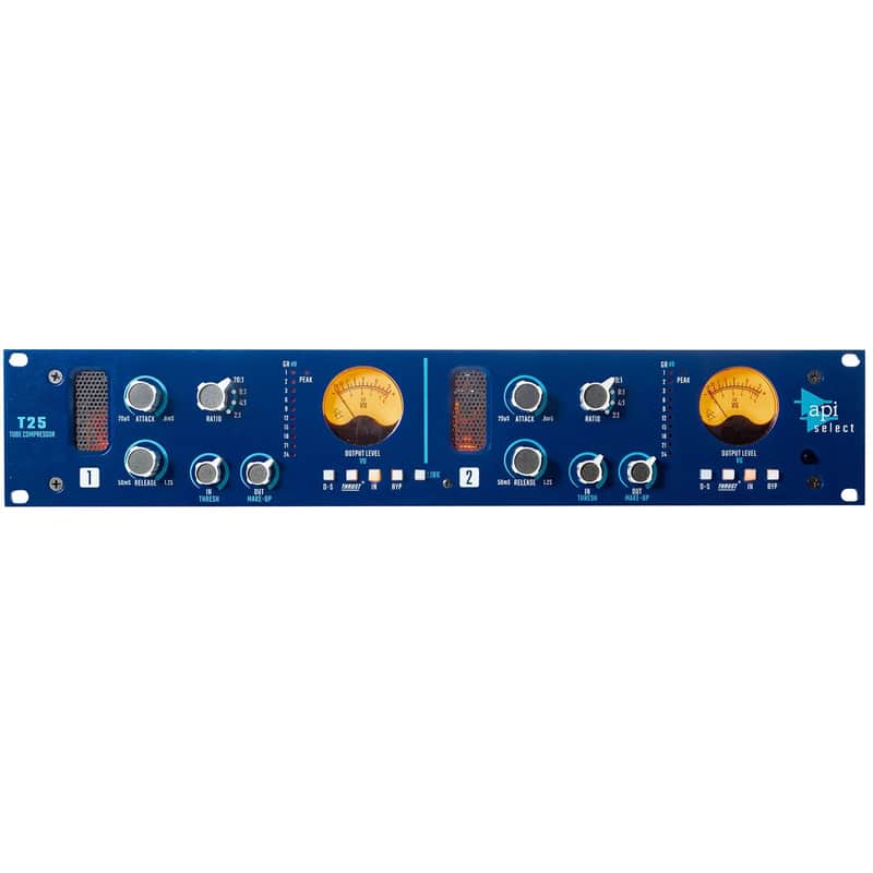 The API Select T25 is a classic 2-channel, FET feedback-style compressor/limiter with a Class-A tube output stage that utilizes a custom API transformer. Built with 12AT7WC and 12BH7 dual-triode vacuum tube, the T25 represents a new direction in API’s line of compressors. It offers the user a powerful and flexible feature set, including the ability for use in either dual mono or stereo mode, and is carefully engineered to deliver classic tube performance. The T25 excels at delivering the unmistakable sound of API and features our industry-exclusive Five Year Warrant.
