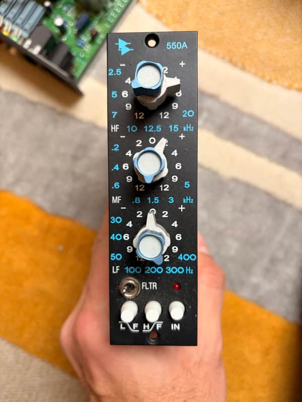 The API 550A is one of the most beloved console EQs of all time, and if you've got a 500 Series frame in your studio, you can find out why for yourself. This iconic discrete three-band is just what the doctor ordered for tracking and mixing all kinds of sources, from guitars to drums to vocals and back again. Each band offers seven selectable center frequencies with a shelf switch on the outer bands, and the bandwidth tightens up as you boost or cut, allowing you to zone in on a specific section of the sound. With +30dB of output headroom, the 550A can boost the daylights out of the low-end on a kick drum without sweating.