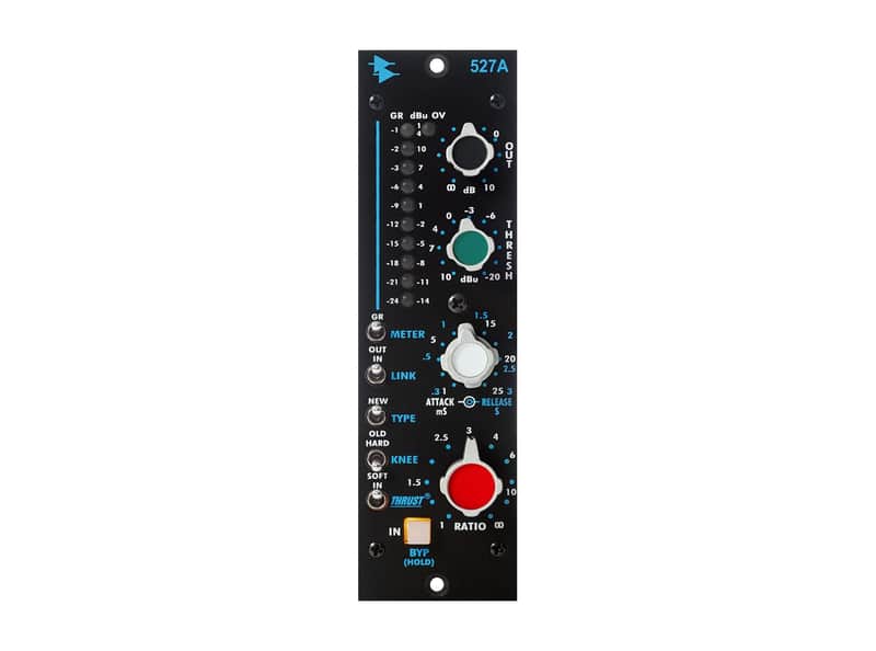 The API 527A Compressor/Limiter takes its place alongside the family of API VCA based compressors, including the 225L compressor and 529, 2500, and 2500+ stereo bus compressors. Anyone familiar with these units will immediately be at home with the 527A.Features common to the line include "feed forward" (NEW) and "feed-back" (OLD) gain reduction methods selectable on the front panel, provide a choice of "that old way" or "the new way" of compression, for the highest level of flexibility in signal gain control. The "old way" or feed-back method is what most of the classic compressors used for the gain control circuit. The "new way" gain reduction is more typical of the newer VCA type compressors that rely on RMS detectors for the gain control voltage.There is a "SOFT"/"HARD" knee switch for an "over-easy" type compression resulting in a very natural, uncompressed sound or a typical sharp knee type that lends itself to a much more severe limiting effect.The patented THRUST® function can be switched in and out via the front panel as well, applying a filter before the RMS detector circuit that preserves that punchy bottom end.Two or more 527A Compressor/Limiters can be linked together via a DC link allowing multiple units to be combined for stereo and multichannel applications.The output level remains fairly constant regardless of the threshold or ratio control, much like the "more/less" Ceiling control on the API 525 Compressor. This allows for live adjustments without any noticeable gain changes in the program level.The 527A Compressor/Limiter makes use of the 2510 and 2520 discrete op-amps and exhibits the reliability, long life, and signature sound which are characteristic of API products.