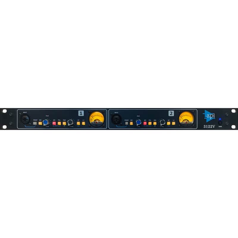 API 3122V Preamplifier (2-Channel Rack-Mount)The new 3122V provides 2 channels of API's signature analog sound and features the same legendary circuit design found in the 3124V and 3124MV, as well as the 312, 512V, and 512c mic preamps. In addition to the familiar combination of 2520 Op Amps and proprietary output transformers that give all API mic preamps that punch and massive headroom, the 3122V also includes front and rear panel XLR and 1/4" inputs (conveniently selectable on the faceplate), a fixed-frequency HP filter, GAIN and the popular Variable Output Level control, as well as 48V, POL, and PAD. Rounding out the expansive feature set are the 3:1 Output Transformer Tap and 2 stunning analog VU meters with a separate peak LED. FEATURES 2 Channels of Classic API Circuit Design API 2520 and Output Transformer Proprietary AP2516 Input Transformer Variable Output Control Fixed Frequency High Pass filter Vintage Style Analog VU Meters 3:1 Output Transformer Tap Selection Two Switchable front or rear XLR Input Front panel 1/4" Hi Z Instrument Input Front panel mic/instrument selection switch Front panel polarity switch Front panel 48V power switch Front panel -20dB pad switch Peak LED Maximum 68dB of gain SpecificationsInput ImpedanceMic: 1500 OhmsHi-Z: 470 kOhms unbalancedOutput ImpedanceLess than 75 Ohms, transformer balancedNominal LevelsXLR channel output: +4 dBuFrequency Response+/- 0.5 dB, 20 Hz to 40 kHzSNRMic: -128 dBHi-Z actual: -106 dBGain RangeMic input: 14 dB min., 68 dB max (inc. pad)Hi-Z: -6 dB min., 48 dB max (inc. pad)MeteringVU calibrated for XLR output, 0VU = +4 dBuPEAK LED calibrated to +18 dBu at 312 amp outputConnectionsFront: two female mic input XLRs, two Hi-Z instrument inputsRear: two female mic input XLRs, two male line output XLRsPower Consumption, Quiescent8 WattsSize19" X 1.75" (1U) X 11" DeepSize (Boxed for Shipping)23.25" X 6.5" X 16.5"Actual Weight9 lbs.Shipping Weight13 lbs.