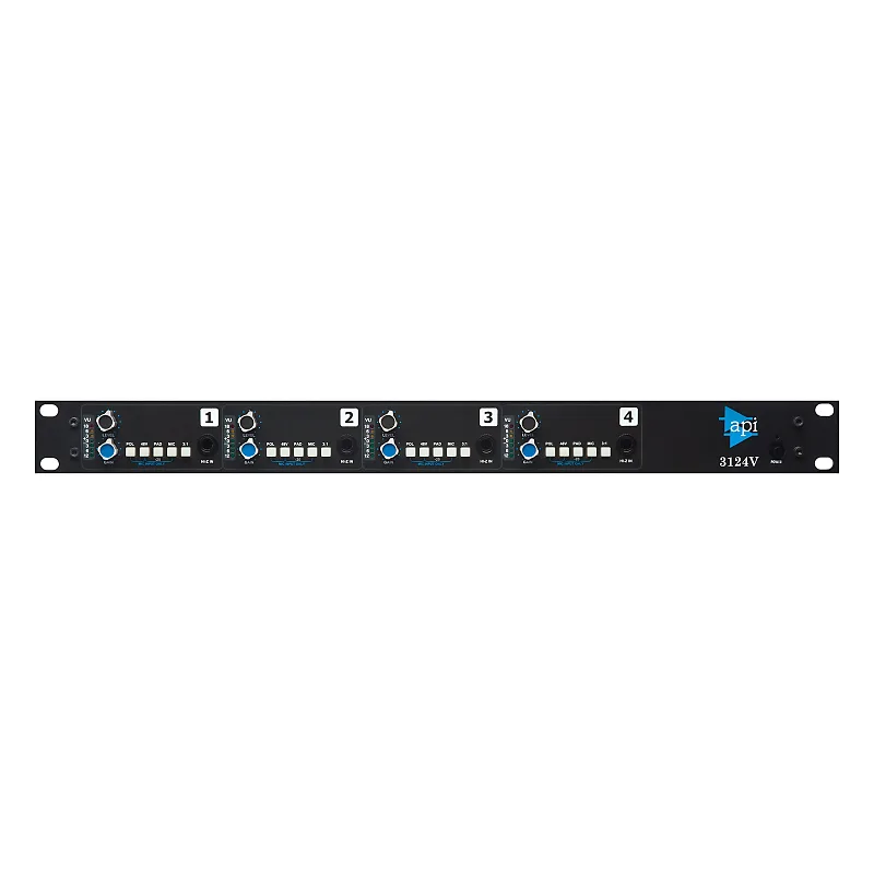 Like the API 3124+, the 3124V is a high quality, compact, 4-channel mic preamp. It is equipped with the RE-115 K mic input transformer and the proprietary output transformer found in all API mic pres and throughout the API product line. Additionally, the 3124V offers Variable Output Level Control and switchable 3:1 output transformer selection. The unit has an internal 48-volt phantom power supply, which is switchable for each channel, as well as -20dB pad switches that affect both the mic and Hi-Z instrument inputs, both located on the front panel.