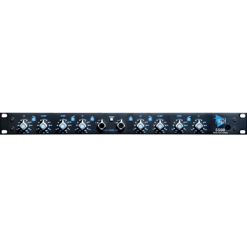 API 5500 Dual-Channel Parametric EqualizerThe beginnings of the API 5500 circuit can be traced back to the original 550 equalizer designed by Saul Walker, the founder of Automated Processes Inc. The 550 was designed as a console equalizer, which uses an unbalanced input due to the architecture of the recording console. Because the ergonomics of a console dictate that the controls take up little space, sometimes the number of included functions can be limited. The 5500 is specifically designed to address these limitations; it has a balanced input, a true straight-wire bypass, an integrated power supply with noiseless muting and a range control that expands its versatility to mastering applications. Typical of API products, the 5500 contains no integrated circuits in its signal path. The gain comes from two hand-built 2520 Operational Amplifiers in each channel. The balanced input is handled by a 2510 Discrete Operational Amplifier, which is similar to the 2520, but without the high-current output stage. A key component of the API sound, the 2520 coupled with the API 2503 output transformer, is capable of delivering +30dBm before clipping. An extremely useful feature in the 5500 is the range control. The range of the amplitude controls can be reduced to 1/2 or 1/4 of their stated scale, providing a means to adjust the tonal balance with finer resolution in an even gentler manner. This is especially useful for complex program material as contained in stems or submixes and is ideally suited for mastering purposes. API's 5500 also features a true hard-wire bypass which wires the output connector directly to the input. Shortly after the power is first applied, or immediately after it is lost, a special circuit enables "bypass mode" so that power thumps are never heard. The 5500's input XLR is connected to an active balanced circuit. The unit's output XLR is driven from a transformer coupled output and can drive any load from 600 ohms or more to full output capability. There is no change from input to output in the unit's polarity, so it is suitable in studios using either pin 2 or pin 3 as the "hot" connection. Additionally, the 5500 has a 1/4 inch input connector that interrupts any present signal on the input XLR. It is balanced and can be driven from either balanced or unbalanced sources. A positive signal on the tip will deliver a positive signal on pin 2 of the output XLR. Using the 1/4 inch input does not bypass any internal circuitry and does not change the gain or operating levels. The 5500 features API's industry exclusive five-year parts warranty and exhibits the reliability and long life characteristic of all API products. FEATURES: Classic 550b Equalizer design Two range switches to individually alter gain steps Usable as a 550b, 550D or 550M Peak/shelf switch on Hi and Lo bands True hardwire bypass Balanced In and Out on XLR Balanced input on 1/4" EQ In/Out switch